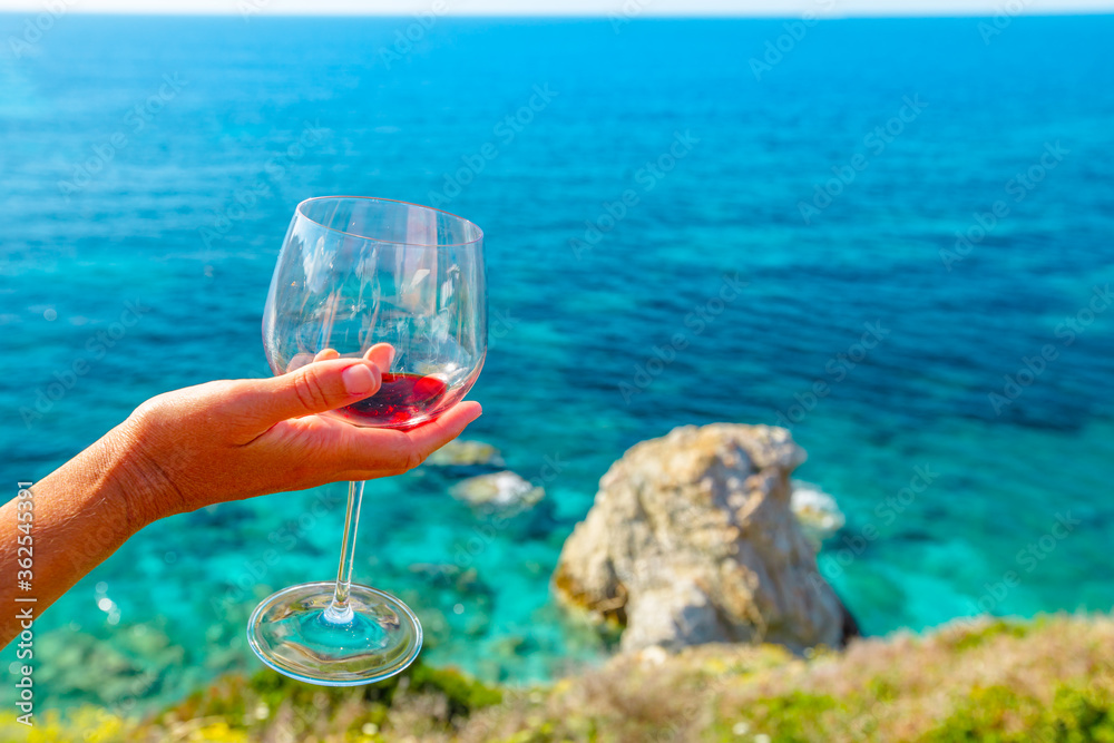 Woman's hand holding wine glass reflecting limestone of famous Sansone Beach from panoramic terrace in Elba Island. Blonde woman summer holiday in Tuscany, Italy. Lifestyle aperitif drinking red wine