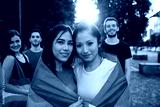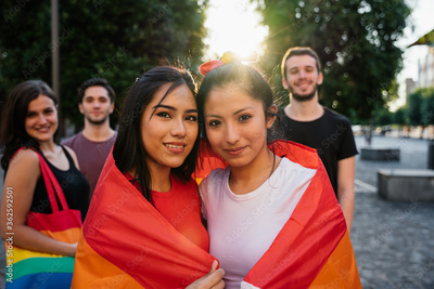 Portrait group of young people demonstration for rights at the gay pride in the city - Two millennials are wrapped in the colored flag - Supporters of the LGBT community - Concept shooting of equality