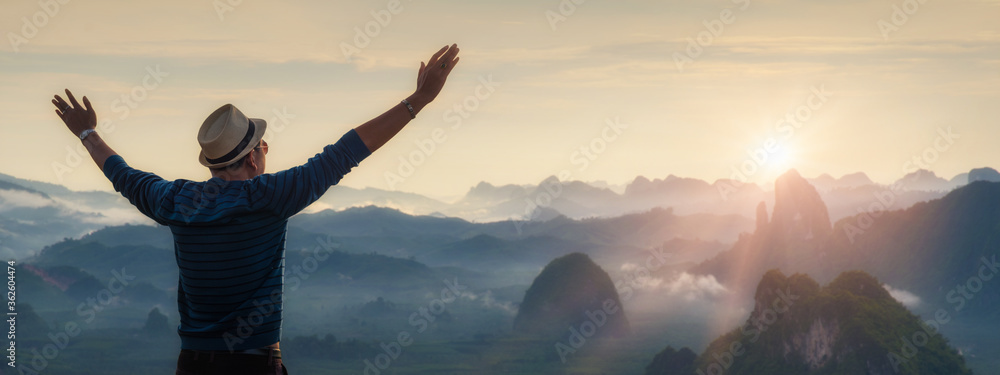 Traveller businessman raise up hand freedom and enjoy view of beautiful landscape mountains hill with fog over sunrise sky in the morning. Travel or Freedom concept.