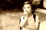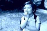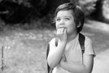Portrait boy putting his fingers in his mouth and looking at the camera with beautiful brown eyes, Excited kid carrying backpack get ready to go to forest for adventure with school summer camp