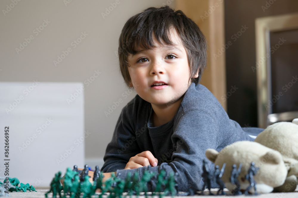 Little boy pointing finger on his nose and laying on the floor playing with soldiers and figurine toys in kid playroom, Active Kid playing wars and peace on his own at home,Imagination and Development