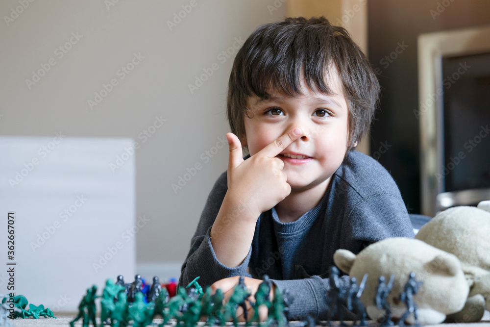 Little boy pointing finger on his nose and laying on the floor playing with soldiers and figurine toys in kid playroom, Active Kid playing wars and peace on his own at home,Imagination and Development