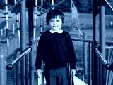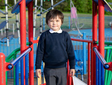 School kid playing in the playground with a funny face,Cute little boy closing eyes while playing in the playground because of the bright sunlight shining on his eyes. Outdoor activities for children
