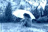 child girl with umbrella in summer rain in the garden