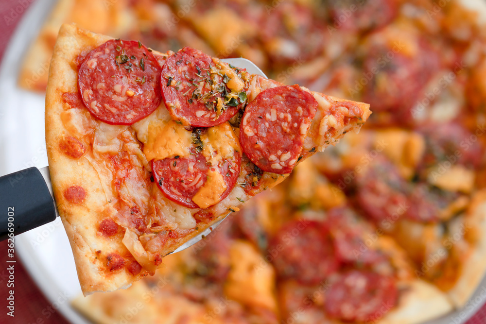 Home made pizza with pepperoni, mozzarella and tomato sauce, Fresh baked pepperoni pizza ready to eat