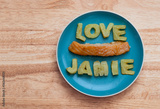 Creative idea of healthy food for kid lunch or dinner, salmon steaks and love letter with name on making from mash potato,Top view of healthy food for school luch or at home