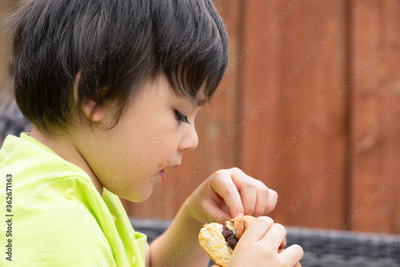Cute happy preschool kid eating hamburger sitting in the garden. Healthy child eating delicious homemade burger outdoors on summer day
