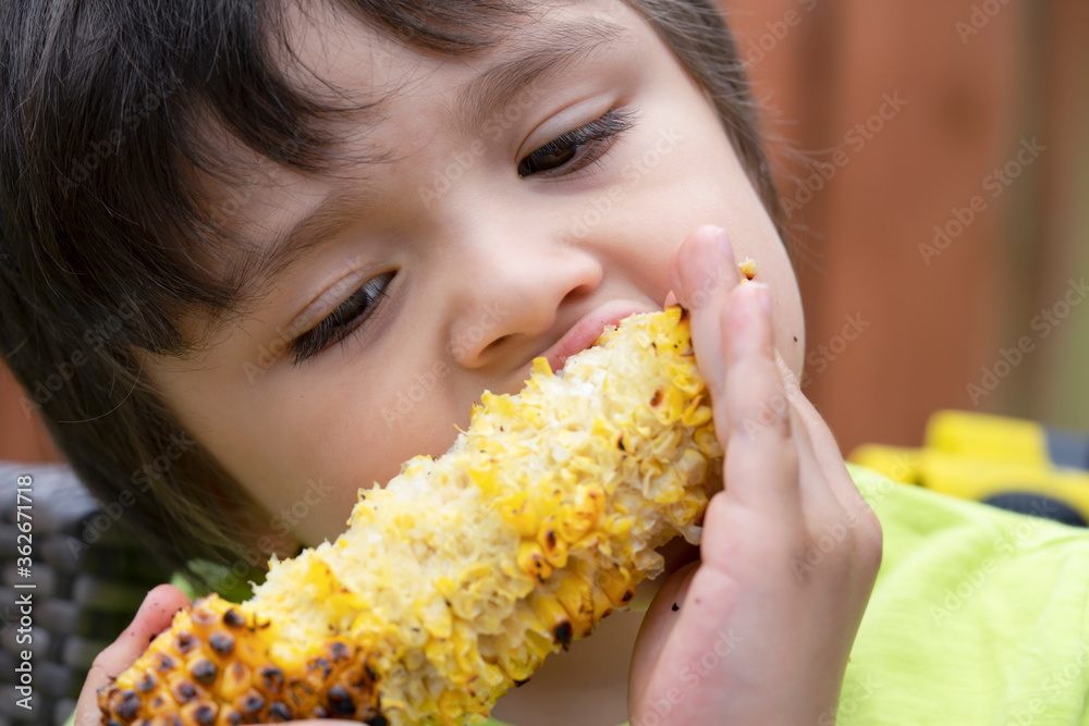 Head shot of hungry little boy eating grilled sweet corn, Kid boy enjoy eating picnic food in thr garden in sunny day on summer, Healthy food for children concept