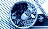 Top view of homemade Bibimbap with fresh york egg on top in white bowl, Korean traditional food,