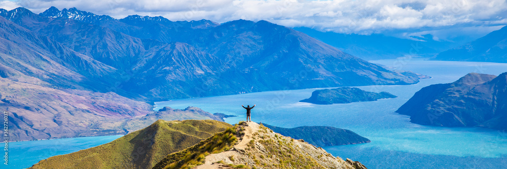 Roys peak mountain hike in Wanaka New Zealand. Popular tourism travel destination. Concept for hiking travel and adventure. New Zealand landscape background.