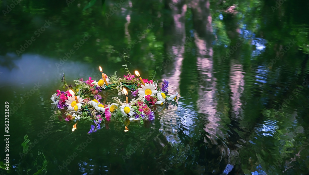 flowers wreath with burning candles in water. old national tradition, fortune telling for pagan holiday Ivan Kupala. Summer Solstice Day, Midsummer.