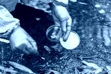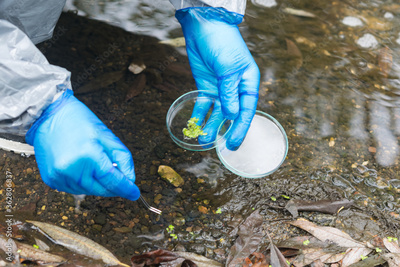 close-up of a Petri dish with a sample of plants from a pond for research in the hands of a laboratory worker, top view, on a background of water