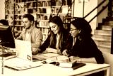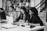 Cheerful diversity group of students sitting in university campus with books and technology learning for exams, multiracial hipster girls smiling and talking while making online research on netbook