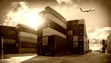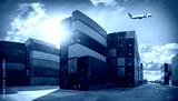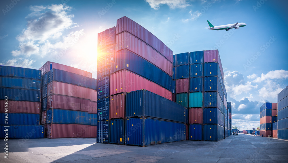 The dock logistics import export and folklife truck transport industry of Container Cargo freight ship and Cargo plane at seaport on blue sky.