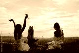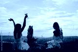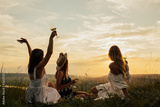 Group of girl friends with wine glasses chilling on picnic blanket at summer day. They enjoying amazing sunset. Copy space.