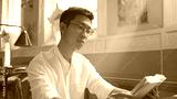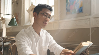 Young asian male student intently reading book in library of university. Attractive guy preparing for exams in campus