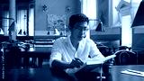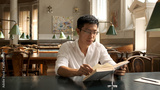 Young asian male student intently studying with textbook and preparing for exams in library