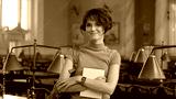 Portrait of beautiful student girl happily looking in camera standing with backpack and textbook in college library