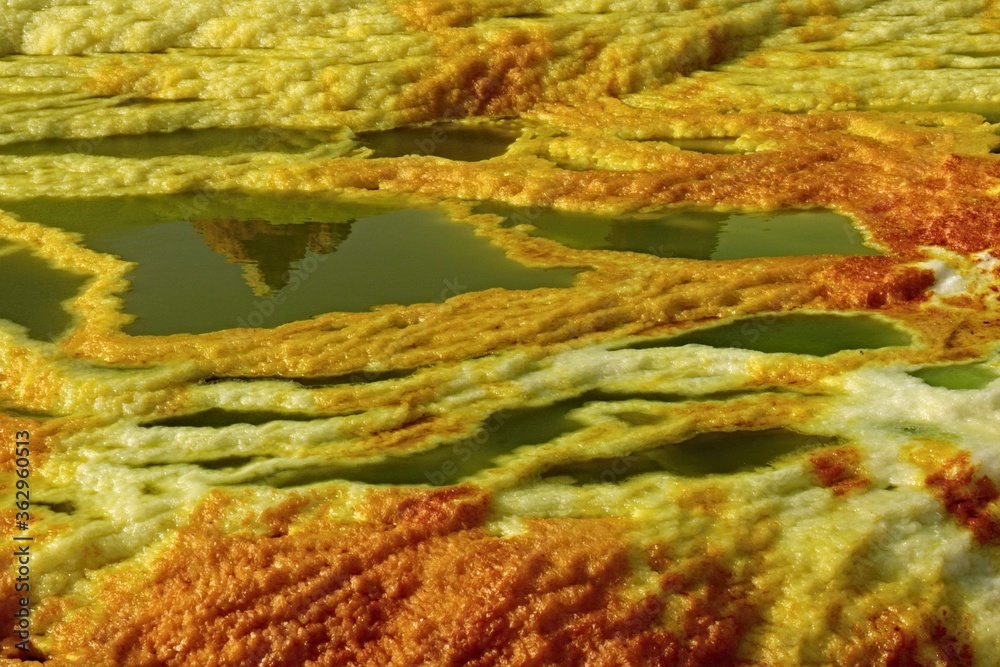 Salt ponds, bubbling chimneys and salt terraces form the bottom of the volcanic crater Dallol, Ethiopia: The Hottest Place on Earth,Danakil Depression.North Ethiopia,Africa