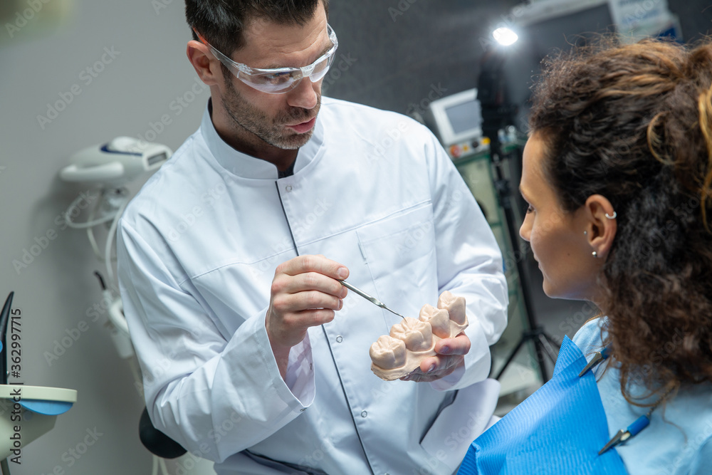 Attractive young woman in stomatology clinic with male dentist. Healthy teeth concept.