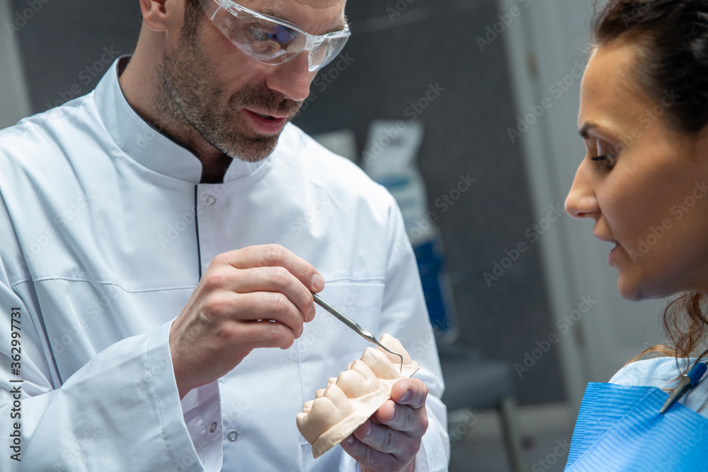 Attractive young woman in stomatology clinic with male dentist. Healthy teeth concept.