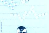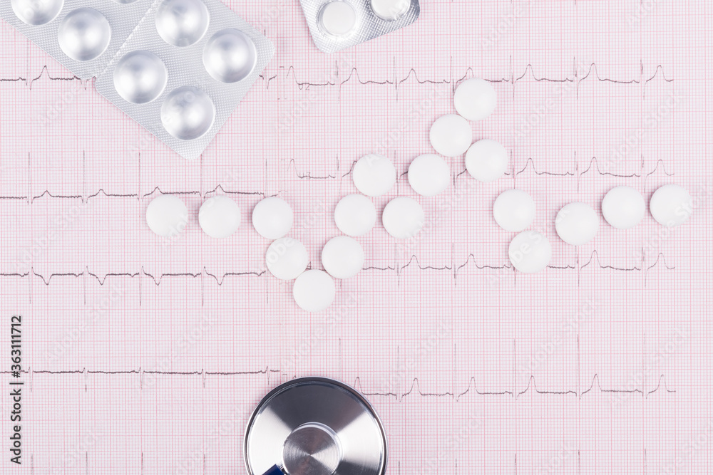 paper with the readings of the heartbeat with white pills, close-up background