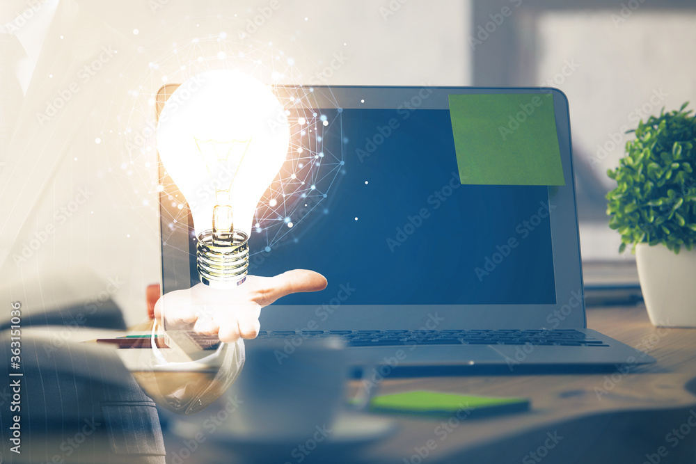 Computer on desktop in office with bulb icon hologram. Multi exposure. Concept of idea.
