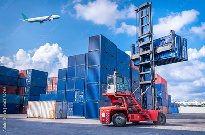 The dock logistics import export and folklife truck transport industry of Container Cargo freight ship and Cargo plane at seaport on blue sky.