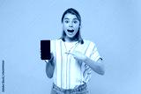Shocked young blonde woman girl in casual striped shirt isolated on pastel pink background. People lifestyle concept. Mock up copy space. Pointing index finger on mobile phone with blank empty screen.