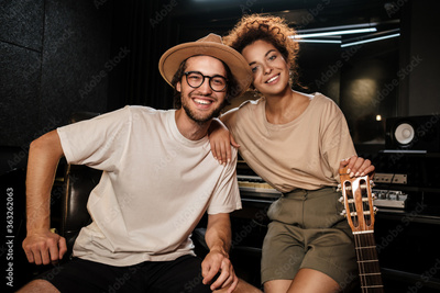 Young stylish musicians happily looking in camera working together on new song in modern recording studio. Music production