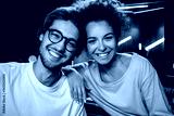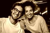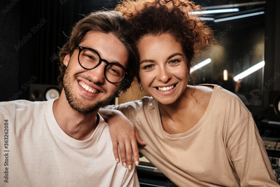 Portrait of young attractive musicians happily looking in camera in modern recording studio