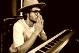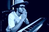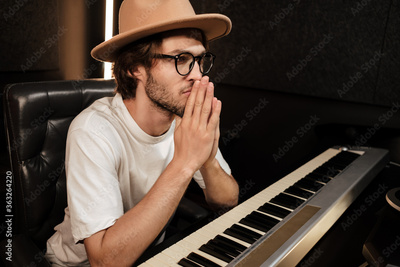 Young handsome concentrated music producer intently working on new music album in modern recording studio