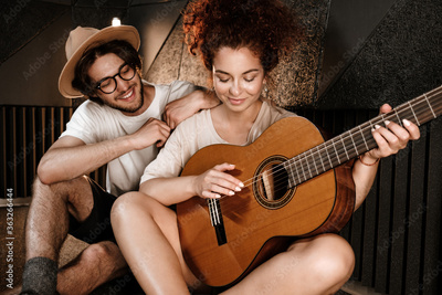 Young stylish musicians happily composing new song on guitar working together in sound recording studio