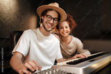 Young cheerful musicians happily looking in camera recording song on piano keyboard for new music album in studio