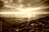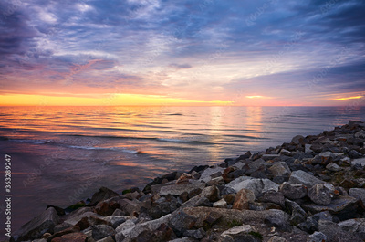 Baltic Sea rocky coast at sunset, Mrzezyno, Poland.
