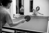 Couple fun playing table tennis or Ping pong indoor together leisure with competing in sports games at house. Father mother and daughter Asian family enjoy recreation exercise stay at home in Thailand