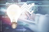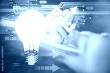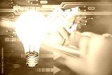 Drawing bulb over woman's hands taking notes background. Concept of idea. Double exposure