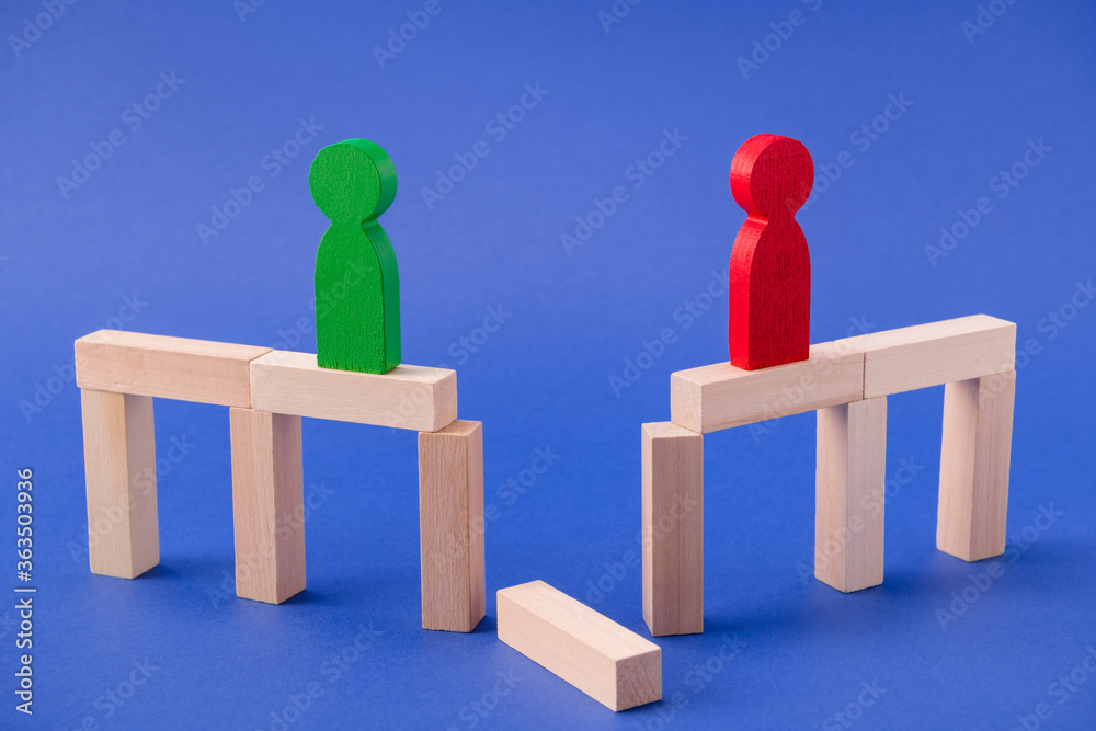 Two lonely wooden figures friends leaders entrepreneurs lovers standing on broken bridge striving distance gap isolated over bright vivid shine vibrant blue color background
