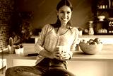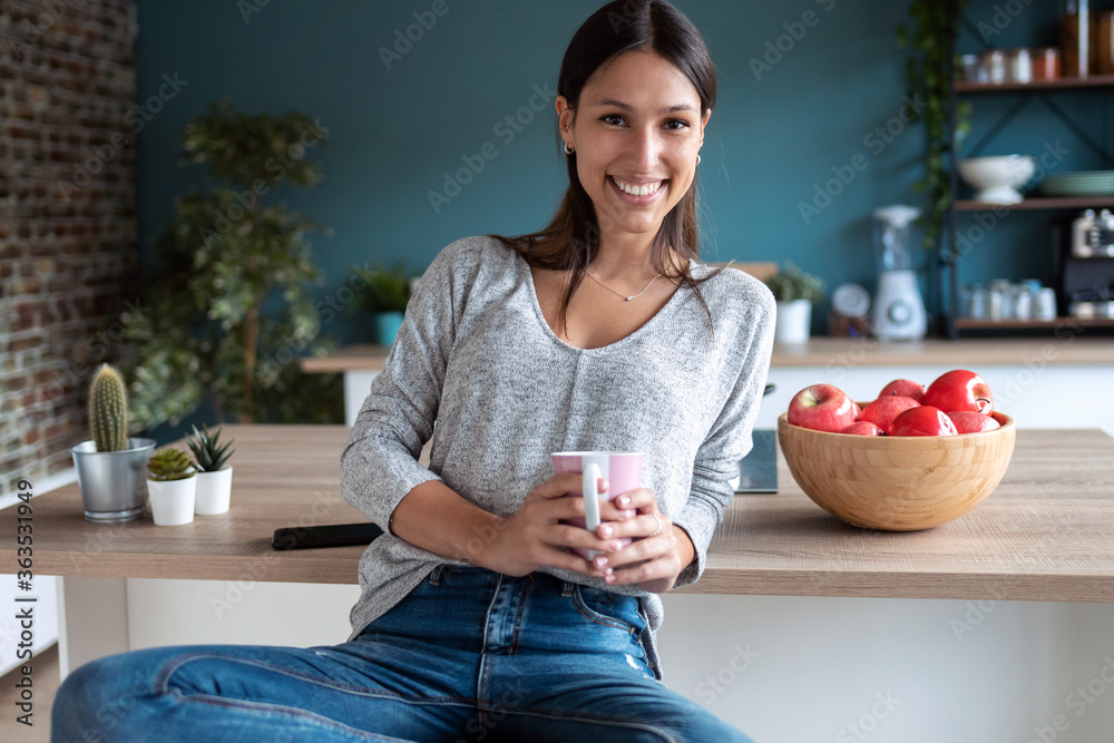 Smiling young woman looking at camera while drinking a cup of coffee in the kitchen at home.