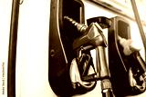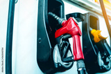 Petrol pump filling fuel nozzle in gas station. Fuel dispenser machine. Refuel fill up with petrol gasoline. Petrol industry and service. Red petrol fuel nozzle. Petroleum oil industry. Oil crisis.