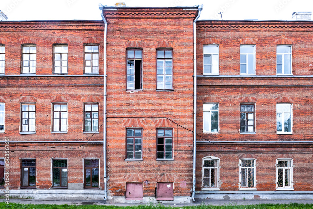 Vintage architecture classical facade red brick residential building front view isolated on white