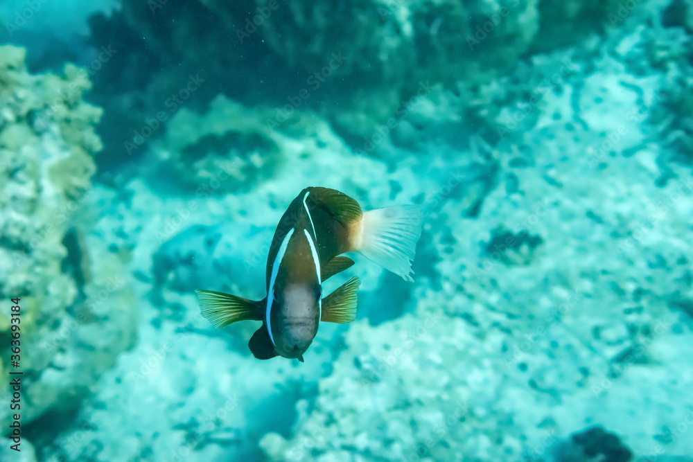 Isolated clown fish in underwater natural environment looking at the camera Crystal blue water