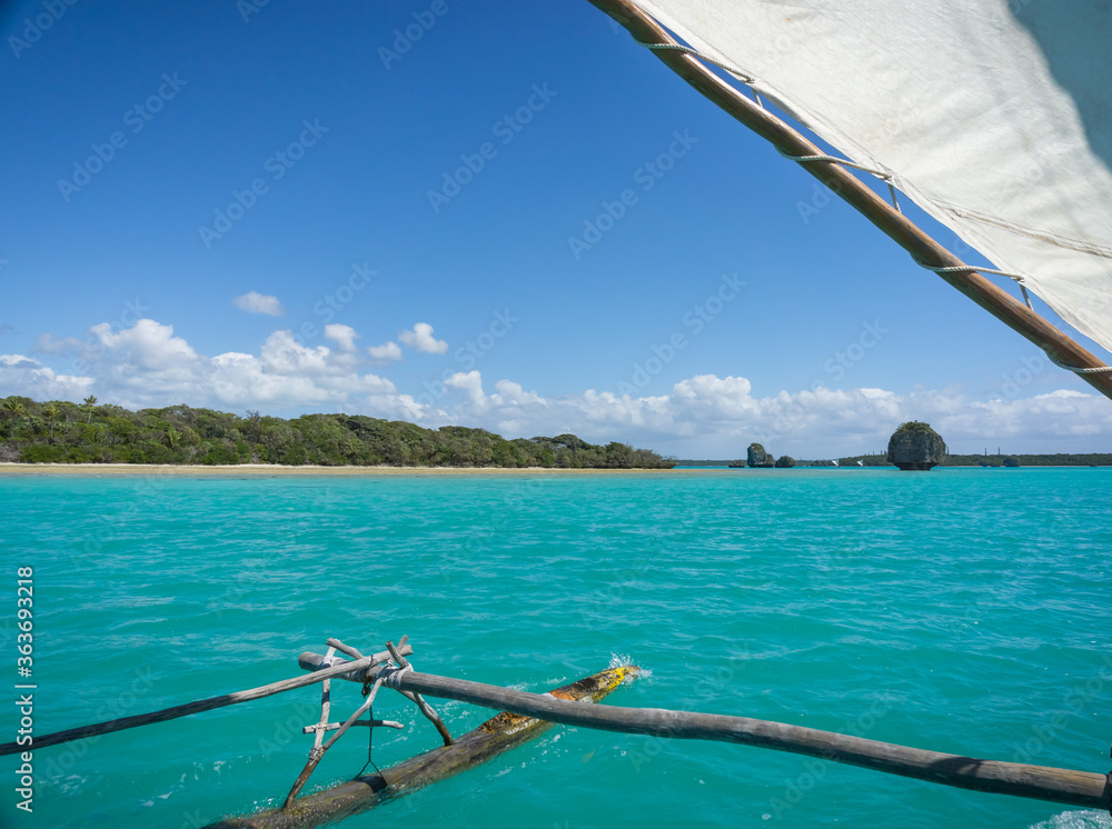 seascape of famous Upi bay, new caledonia from a typical caledonia boat : turquoise lagoon, typical rocks, blue sky