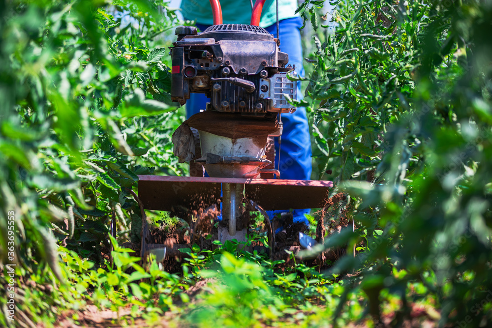 Farmer working with agriculture weeding machine around vegetable plants. Horticulture.