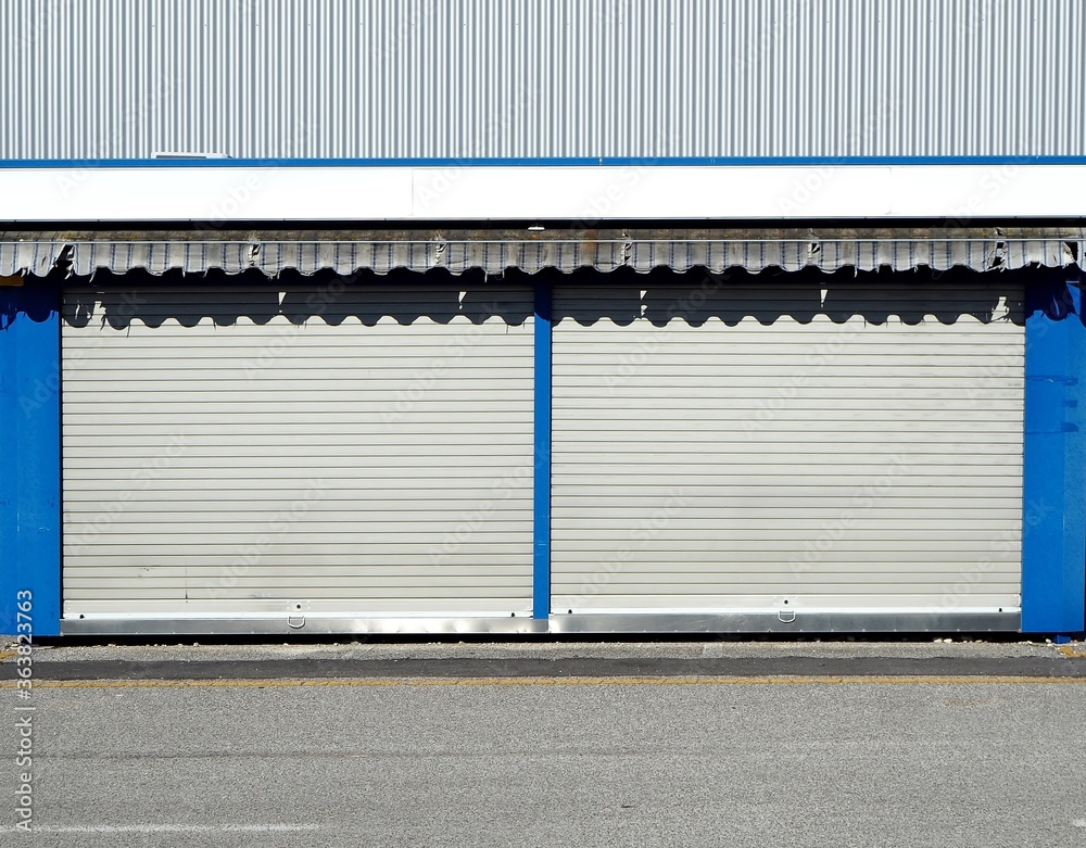 Shop retail on the road side with metal shutters closed for discontinued activity. Sidewalk and asphalt road in front. Urban background for copy space