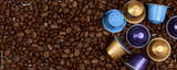 Close up colorful capsules or pods for coffee mashine on the bed of roasted grains.