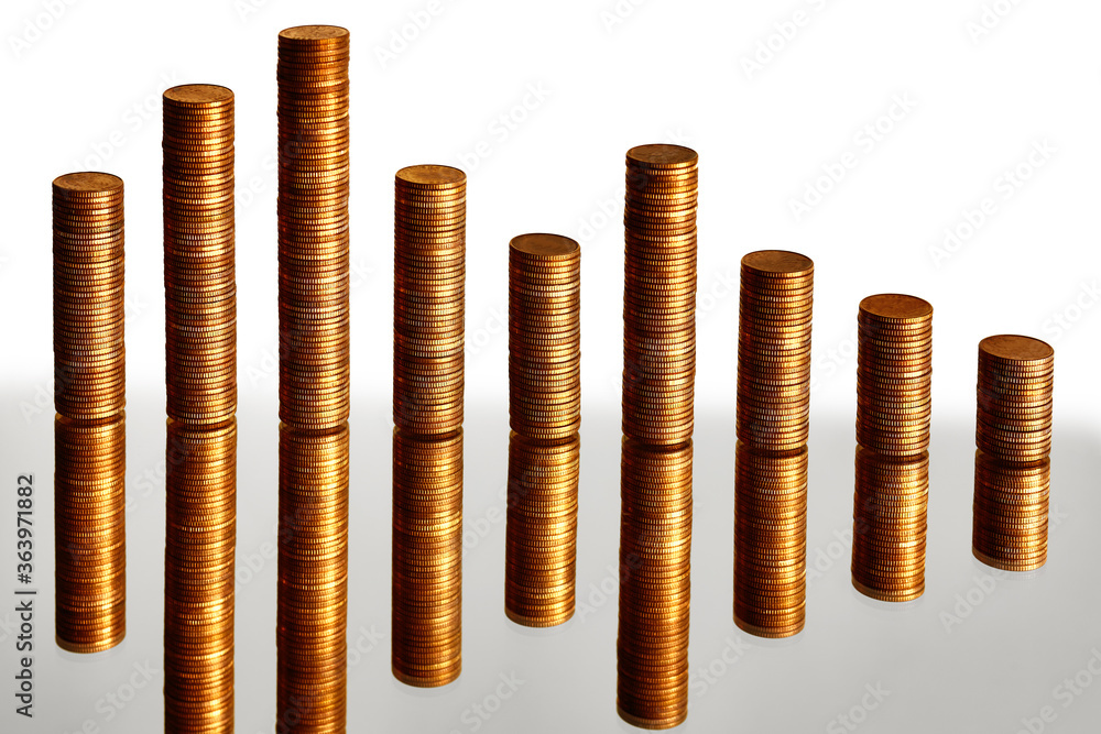 Stacks of old golden coins arranged as a chart reflected in mirror.