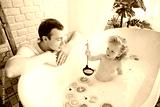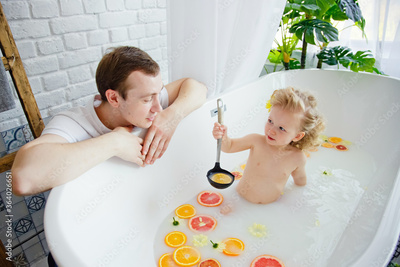 A cute little girl is sitting in a bath with milk and orange and yellow fruits and flowers. A young family spends time together. The concept of a family holiday. Bathing and playing with the child.