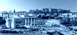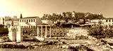 Panoramic view of Library of Hadrian, Acropolis in distance, Athens, Greece. It are famous tourist attractions of city. Urban landscape of Athens