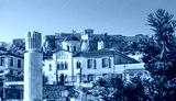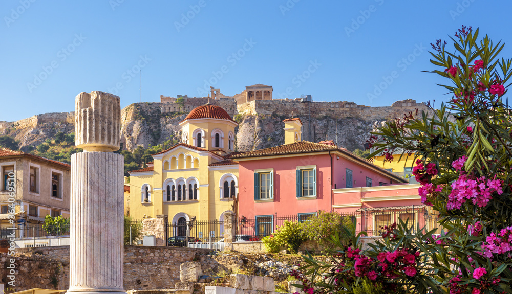 Old houses in Athens, famous Acropolis in distance, Greece. Beautiful scenic view of Plaka district in Athens city center
